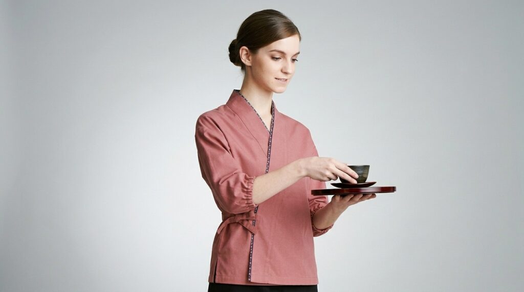 This elegant wrap-style shirt in soft dusty rose offers a perfect balance of oriental charm and modern functionality. Featuring a delicate patterned trim and practical elastic cuffs, it is meticulously crafted for professionals in the cafe, bakery, or wellness industry. Experience a touch of serenity and style that enhances your workplace ambiance.